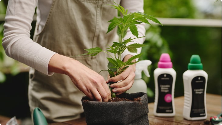 Topfe die Stecklinge möglichst bald in einen Topf (mindestens 6 Liter mit Drainagelöchern) mit passender Erde ein. Je mehr Platz die Wurzeln haben, desto kräftiger kann deine Pflanze wachsen.